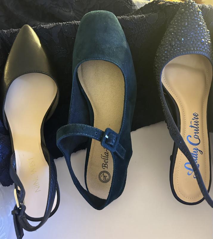 The shoe is very pretty. It feels comfortable when trying them on, but I have not yet worn them out to know the true comfort level. However I was disappointed with the color. I ordered the navy blue, and it's actually more of a teal color. The color is pretty, but disappointing if I don't have clothing to match the teal shoe. Below is a picture of the navy Bella shoe in between a black shoe and a navy shoe. All 3 shoes are against a Navy dress.