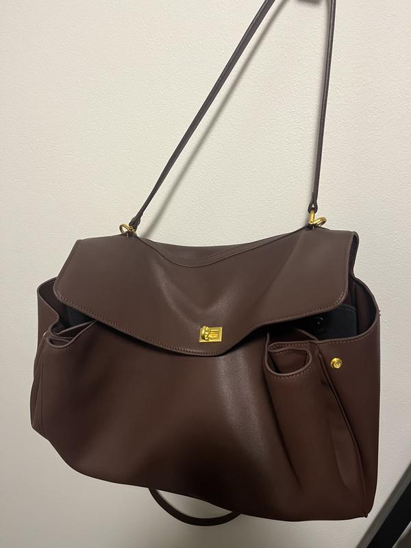 Web ID: 21451051This is my new favourite work bag! The leather is a beautiful chocolate brown and buttery smooth - I ve received so many compliments about how on trend it is. It does have a slightly slouchy look (while still being elegant) - use bag organisers if you prefer your bags with more structure. The shoulder strap is amazing, it s probably the first shoulder bag I ve worn that hasn t constantly slipped off my shoulder. I use this bag for work everyday and carry a large laptop (in a soft case), lunch box, notepad and other essentials and there s still a LOT more room - perfect if you re a úmust carry everything everywhere all the time ù kind of person. Exceptional value for money (I used a new customer discount to get an even better deal). Overall 5/5, absolutely obsessed.