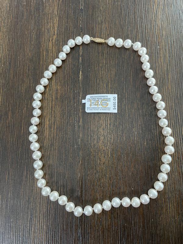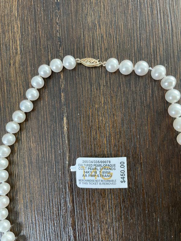 Beautiful pearl necklace! Pearls have beautiful lustre and 14k gold clasp. Looks stunning on. Classic and classy, will go with anything. So happy with this necklace.