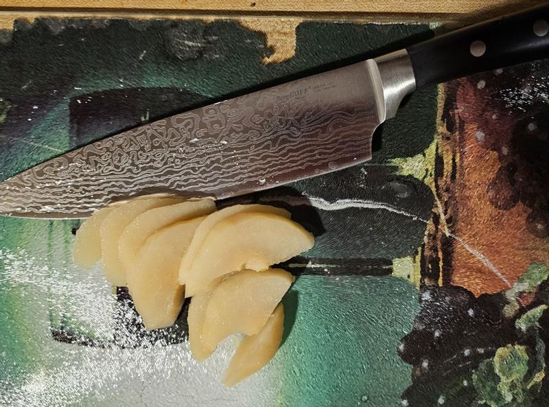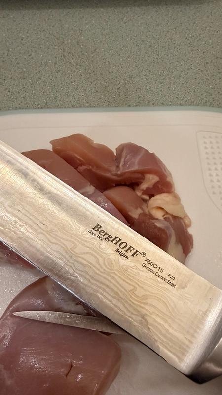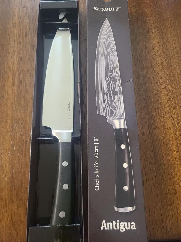 I love this BergHOFF Antigua 8 inch chef knife. It has good weight but not too heavy. The triple riveted handle is comfortable in your hand. The blade is high quality German steel that has a Damascus pattern for such a cool look. This knife is razor sharp and slices through any food with ease. I definitely recommend buying this knife.