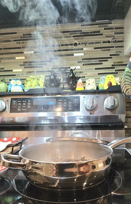 I like everything about this skillet pan, it is lightweight and durable at the same time, so easy to clean, and stainless steel is one of the best for cooking! The design is timeless, it is great for cooking a variety of dishes, i use it a few times a week, and the size is also great, not too small not too big, just perfect. The brand is also known for high quality products, so high quality was expected. Also, I appreciate that it comes with the lid, it is a must when cooking and storing food.