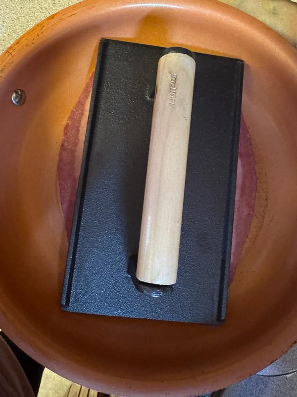 I have wanted a cat iron press forever. This press fits perfectly in my round medium cast iron pan and my round medium fry pans. At 3 1/2 pounds, it's an optimal weight for grilling a pressed sandwich or searing protein. The wooden handle not only adds beauty to the piece, it stays cool while using. The small waffle pattern on the press provides even pressure when searing so it will only make sear lines if I use it with my ridged grill pan. My favorite use is for creating a beautiful EVEN golden sear on chicken cutlets. Super easy to clean, I only hand wash it.