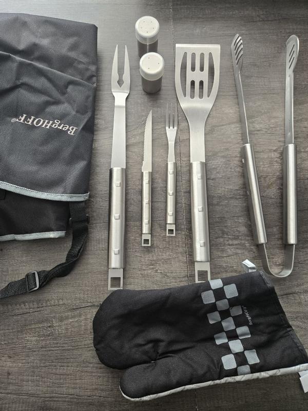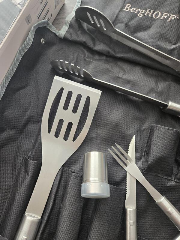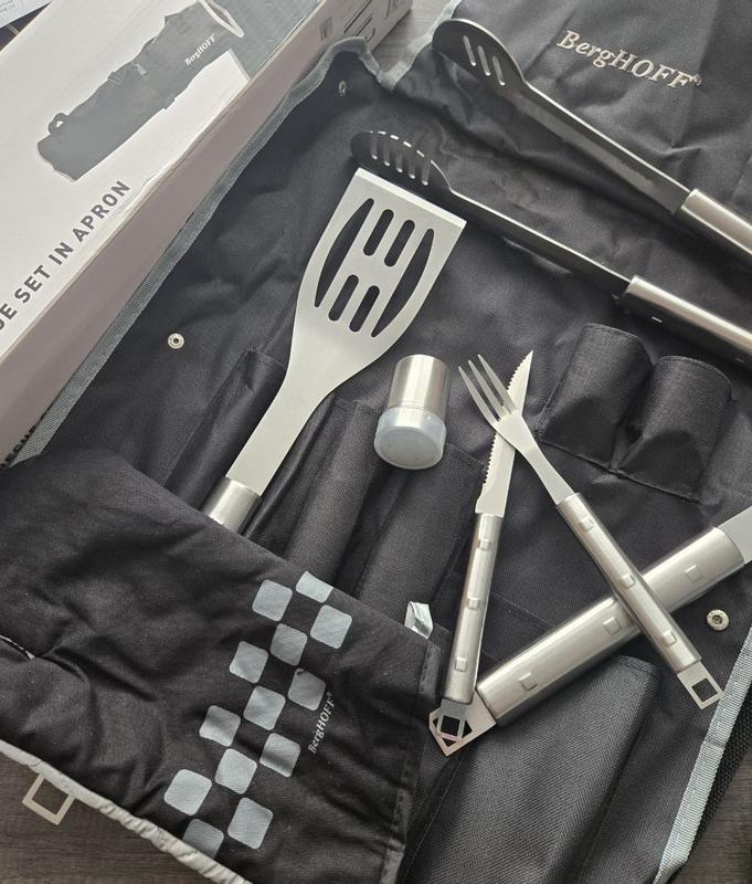 I've been impressed with the Berghoff Cubo 9-piece stainless steel BBQ set with wrap. The set includes a convenient storage wrap that can be hung on the kitchen wall for easy access, and it can also be turned into an apron when you're ready to use the tools. The stainless steel construction is durable and easy to clean, even after getting stained with sauces or burnt meat. The set is very portable, making it perfect for picnics, as the wrap can also be used as a carrying bag. While I've only used the tools a few times, the design appears ergonomic, and the heavier weight indicates good quality. The set includes a barbecue mitt for safer handling. The reasonable weight of the tools should not tire your hands or arms during use. Overall, I believe this BBQ set offers good quality, convenience, and durability.