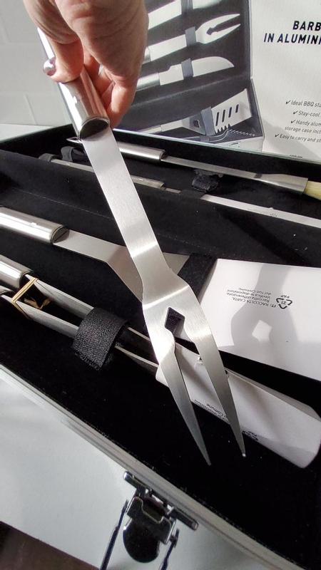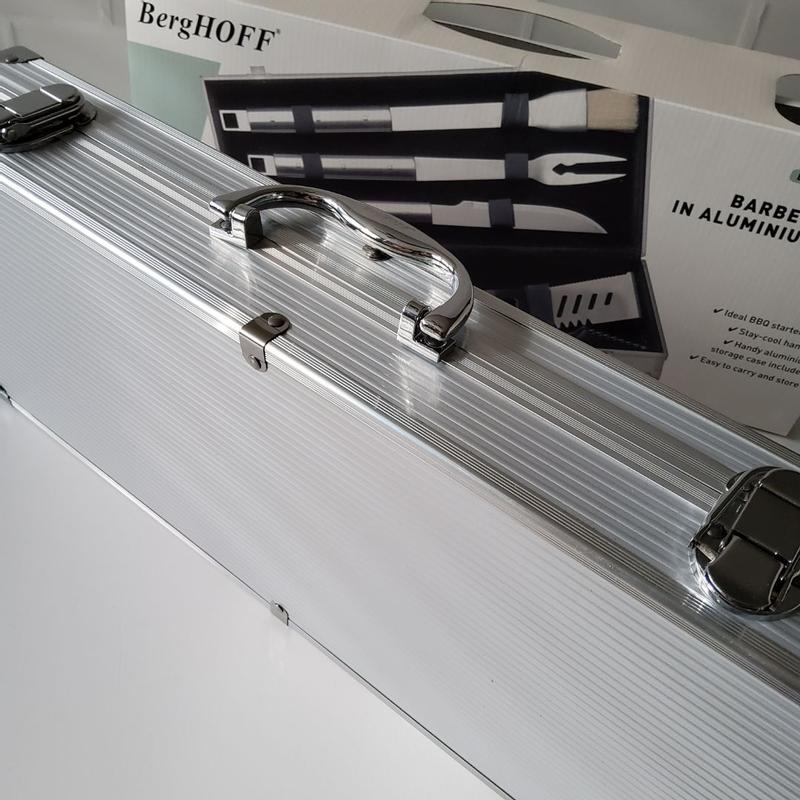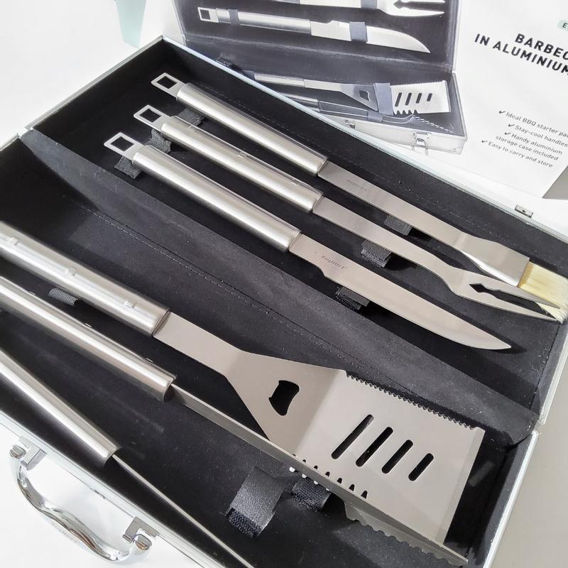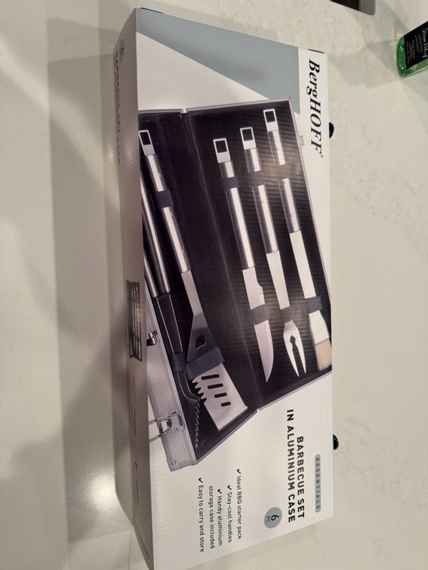 This BergHOFF Cubo 6Piece Stainless Steel BBQ Set with Aluminium Case is perfect for any grill master! This set comes in a sturdy and handy aluminium storage case with locks. The handle makes it easy to hold and carry this case. This set has all the essentials that you need for grilling. It has a small brush, a meat fork, a barbecue knife, a slotted turner and tongs. These tools have a nice sleek design and are made of stainless steel. The handles are nice to grip while using the tools. The tools are easy to clean and can be nicely and safely stored in the case until the next cookout! This is a wonderful set and would make a perfect gift for anyone that loves to grill. I highly recommend this set!