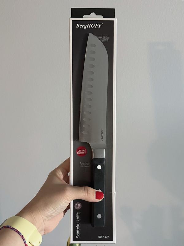 This BergHOFF Dina Gene santoku knife is perfect for everyday cooking! The strong stainless steel blade cuts vegetables, meat, and fish very easily. If you want a good knife that works well and looks beautiful in your kitchen, this is a great choice.