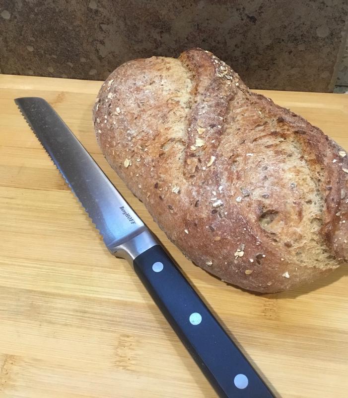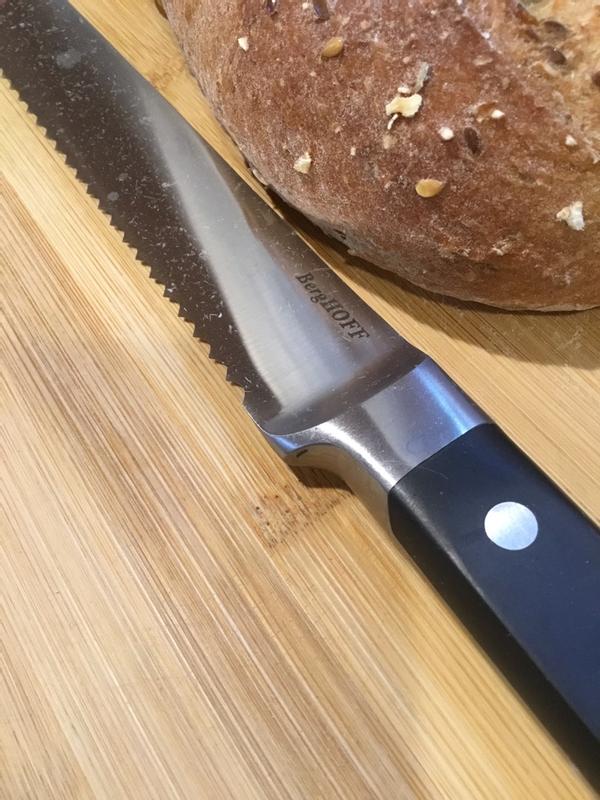 We are big bread fans in my house! I have never owned a Berghoff product before, so I was excited to try the Dina Gene stainless steel bread knife. And this is a great knife! As you can see, the blade is really toothy, and cuts through even the crustiest bread with no problem. It makes a nice even slice without tearing the crust or the soft bread inside. It’s a really balanced knife, and appears to be very well-made. And it definitely has some weight! I’m sure we will be using this a couple of times a week in our household!