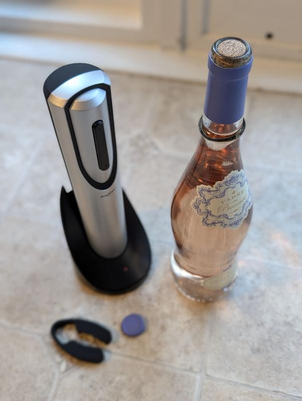 I've been using this wine opener for a few weeks now and I've found it very practical. Assembly was easy, and everything came ready to use. The device feels solid and well-made. It has enough power to extract corks effortlessly. It's ergonomic and fits comfortably in the hand. Maintenance is simple, as it only needs to be charged. It's quite portable thanks to its charging base.