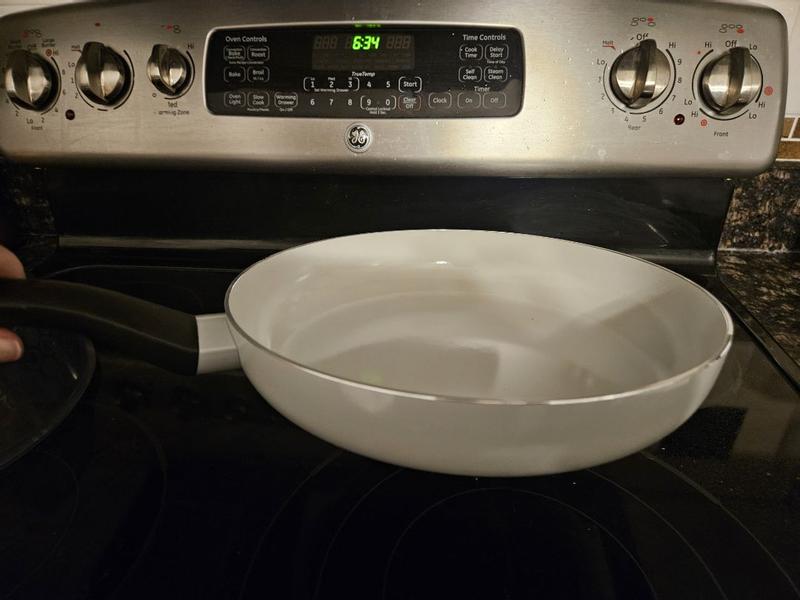 I really like this pan ! A very sturdy 8" pan , perfect for smaller foods to cook in. Is a ceramic, cera green non stick and the handle is very nice to hold on to, and the handle stays cool while cooking. The cream color of the pan is nice too! Has a two year warranty .