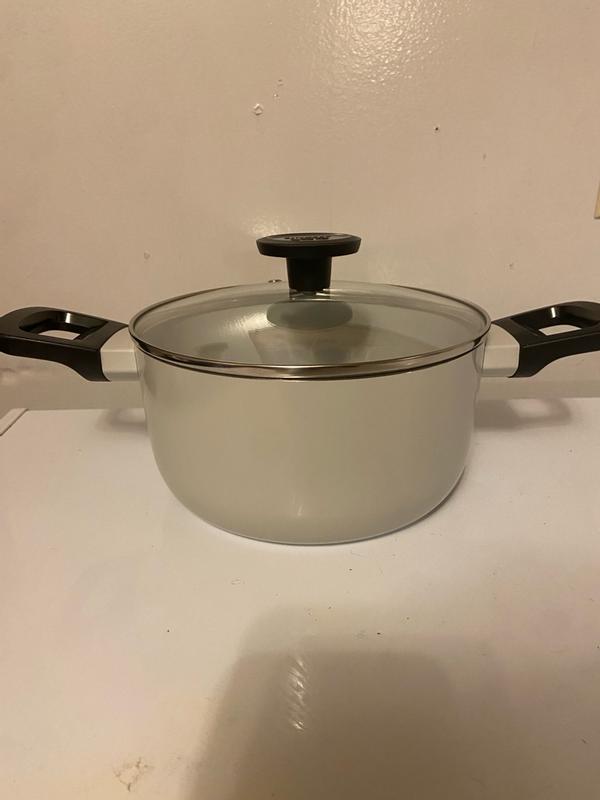 I really like this pan ! A very sturdy 8" pan , perfect for smaller foods to cook in. Is a ceramic, cera green non stick and the handle is very nice to hold on to, and the handle stays cool while cooking. The cream color of the pan is nice too! Has a two year warranty .