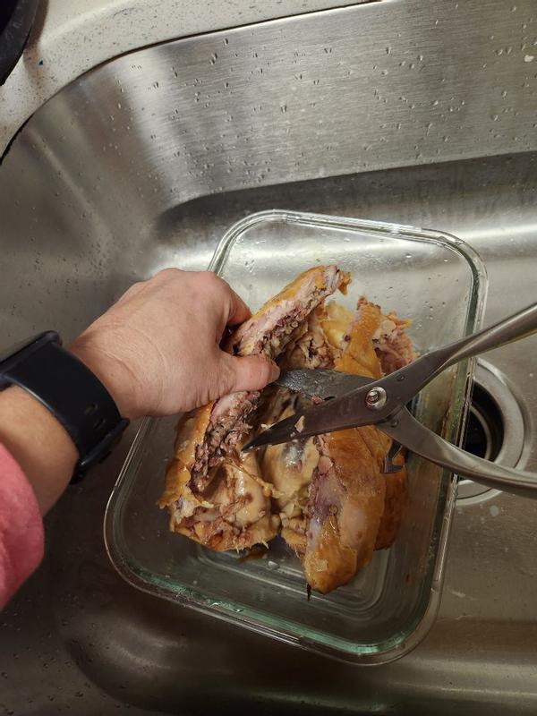 These cut through the chicken spine as expected. They are a bit unwieldy for my small hands. I wish they would come apart for easier cleaning. The close pin helps to manage them in the drawer. I like that its all stainless steel.