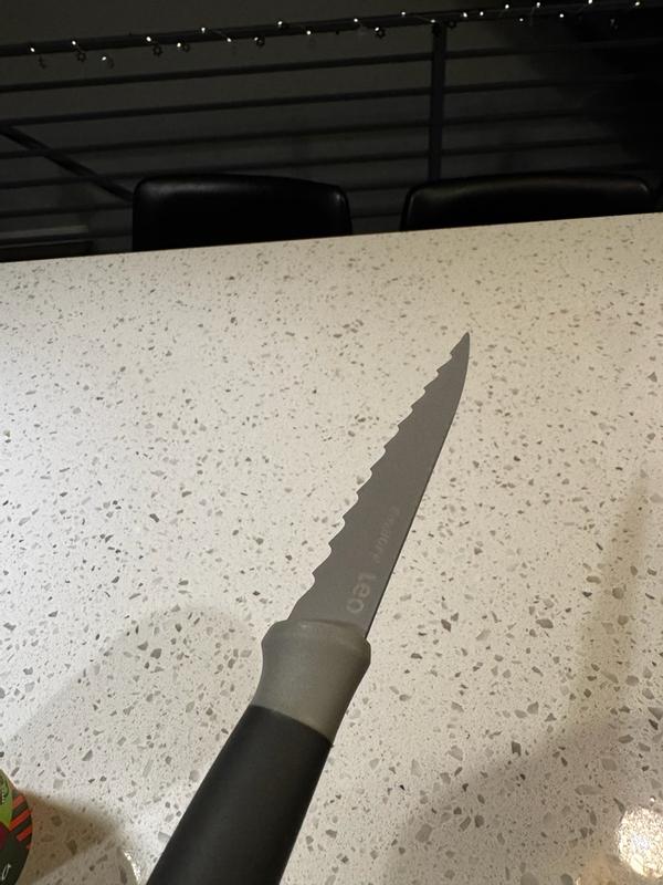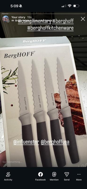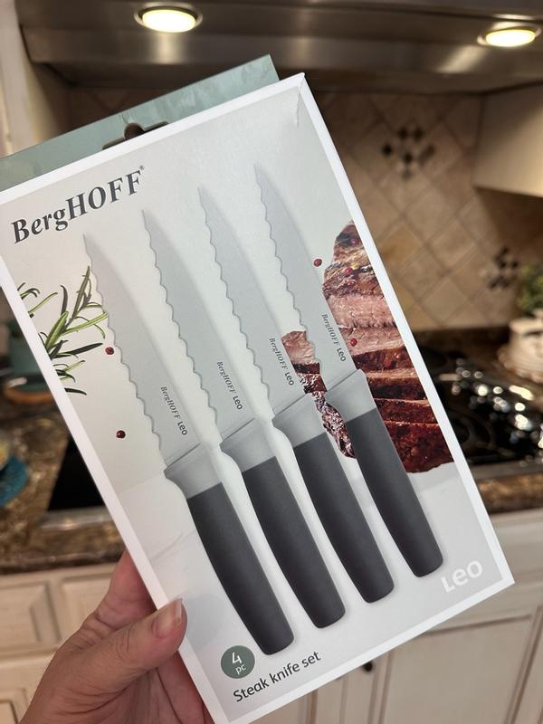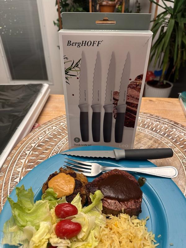 I’ve been really happy with these BergHOFF Leo steak knives. They look sleek and modern and actually work very well. The serrated blades cut through steak without tearing it up, which is something I notice right away with steak knives. The soft-touch handles are also very nice. They’re comfortable to hold and feel secure in your hand. They’ve held up well so far and look great after regular use (I do hand wash them, as recommended). Overall, this is a solid, good-quality set of steak knives.