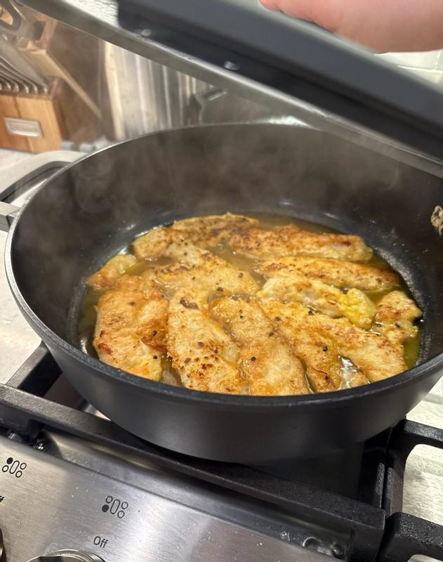 I absolutely love this sauce pan! I use it daily for almost every meal and it continues to impress me. I recently made lemon chicken in it and it held enough pieces for my family without feeling overcrowded. Nothing stuck to the bottom and it’s super easy to clean and feel durable.