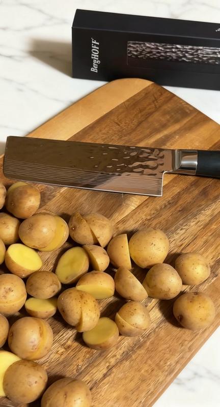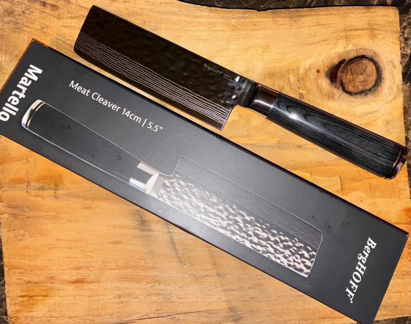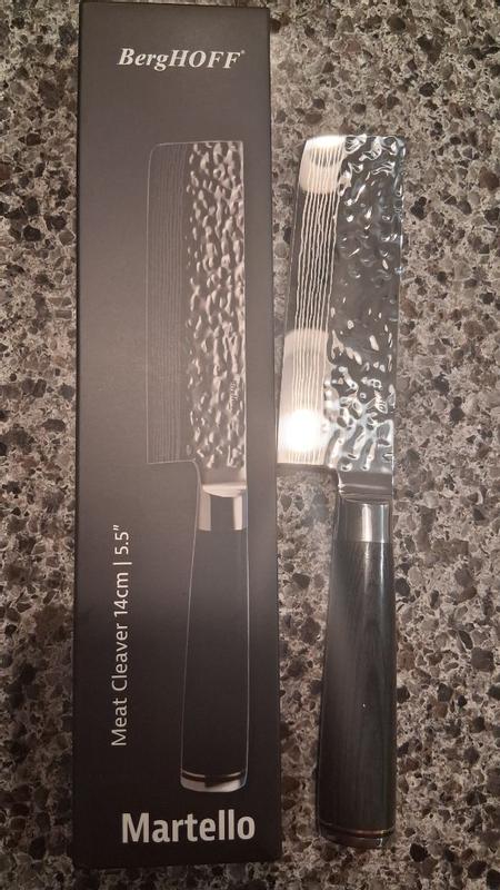 The BergHOFF Martello 5.5 Cleaver is a beautifully crafted sharp blade great for all your kitchen needs. The durability and strength of the blade, balanced by the just right amount of weight handle it's lightweight but strong. Easy to use and maneuver and come sharp out the box. Highly satisfied with the BergHOFF Blade standard and the craftsmanship of this Cleaver from the hammered detail to the wooden handle, truly Chef's kiss.