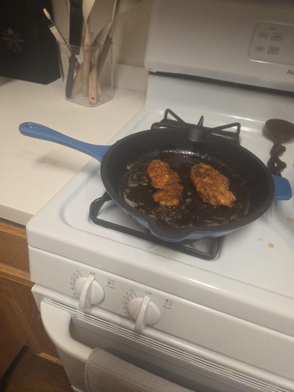 I’ve been needing a new skillet and wanting a cast iron one so when I saw this on a free grab I had to have it!! I was even more excited that it was red because my kitchen theme is red and black and it matches my current cookware set! I cook fried chicken quite a bit and this skillet definitely cooked it much better than my current set. It was also SUPER easy to clean. I just need to buy a skillet handle hot pad before I cook anything else.