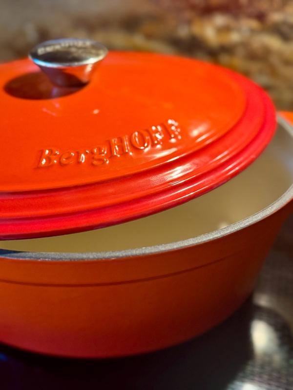 I absolutely love the shape and color— it’s not a solid orange, but an ombré. It’s beautiful. The basting points on the lid are a nice feature, as well as this being good for practically all stove tops and ovens. The enamel finish is far from perfect — there was a defect in the enamel on the rim of the lid where it was coated. Luckily, it’s on the edge but also may also be prone to chipping. This is so easy to clean and maintain because it’s got an enamel coating on the inside. All I needed was some soap and water. I love using cast iron for the even heat and how versatile this is. I love the 5 qt because the sides are high, and I can make soups in this, bake breads, or fry. This is my kind of one pot cookery, from the oven or stove top to the table.