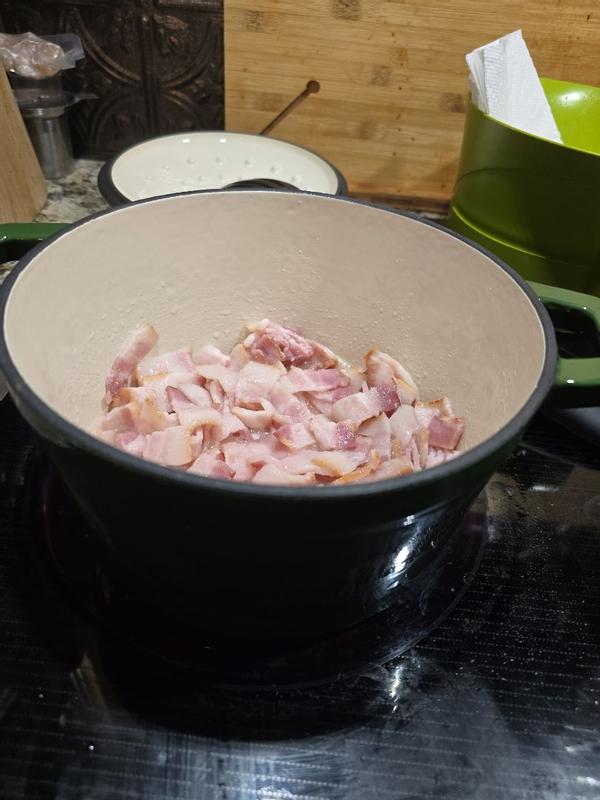 This dutch oven cooked my soup to perfection. I got an browning on my bacon and my ground beef. My soup simmered beautifully and left it with an even heat throughout. The enamel is a gorgeous green color and the maintenance is suggested hand washing to maintain the enamel. High quality.