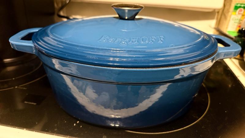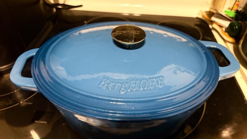 I received this BergHOFF Cast Iron 5qt Oval Dutch Oven for free in exchange for my honest review. I really love the blue color as it somewhat matches my other cookware. It cooks evenly and quickly on the stove with ease. The heavy lid fits securely plus the handles are easy to hold. I have been using it quite a bit during the cold weather, finding recipes for stews, curries and chili to make. The size is a little too large for me, but I can food prep and freeze leftovers which is a great timesaver. Plus the enamel coating makes it easy to clean after use. I haven’t owned a Dutch Oven before, but very impressed with the quality and how easy it is to use. .