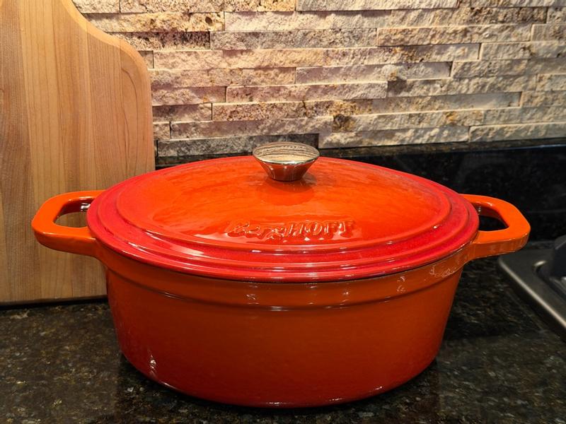 I really like this BergHOFF cast iron oval Dutch oven. It’s very versatile. I have fried chicken, made rice and soup in this cookware. Without the cover it’s oven safe to 600° It’s very sturdy and I love the color!!