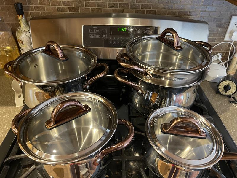 The pots and pans are incredibly heavy, and the lids fit snugly on top. The handles get little warm but not hot, and I was able to comfortably lift and drain the water without needing potholders. Cleaning is easy.
