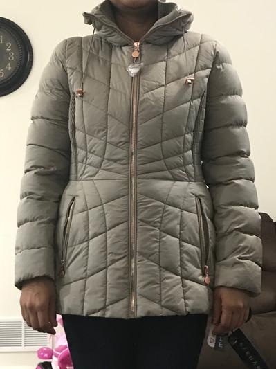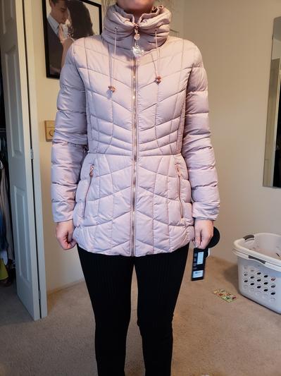 I love the fit Im 5”8 240 and curves the 2XL fit great!! So flattering with the stitching and elastic sides accenting the hour glass figure . Does not add weight and make you bigger like most puffers . The sleeves were long enough which often they are short . My only complaint is the color is far more Grey then blue but glad I could get something other then Black which often is the only plus size color. The hood also is only 1 layer of fabric so not great in the PNW but the style makes up for it