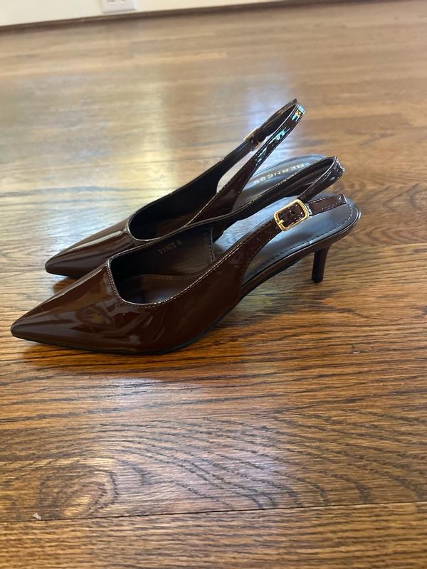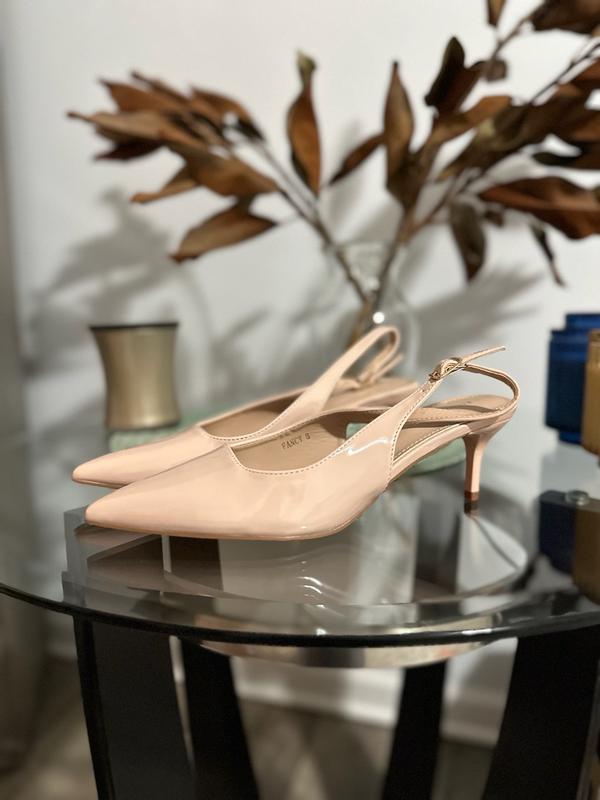 These elegant slingback heels feature shiny patent leather that catches the light beautifully. The low kitten heel makes them comfortable enough for all-day wear while still looking stylish and professional. They’re perfect for the office or special occasions when you want to dress up without sacrificing comfort.