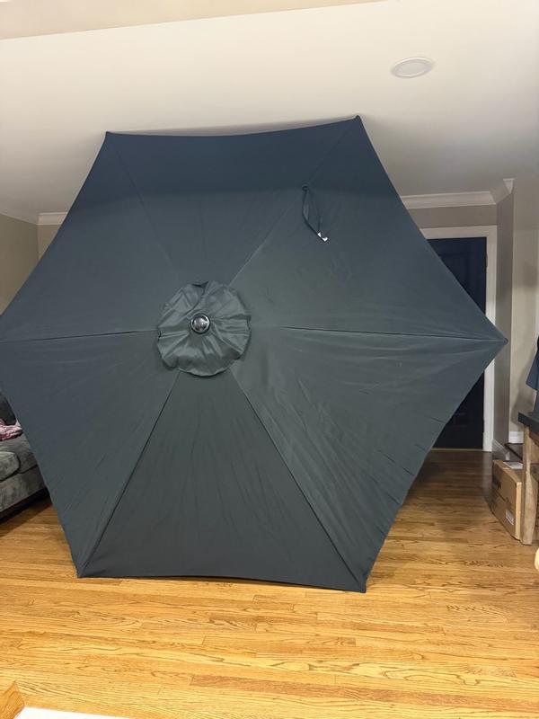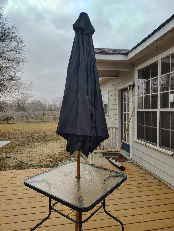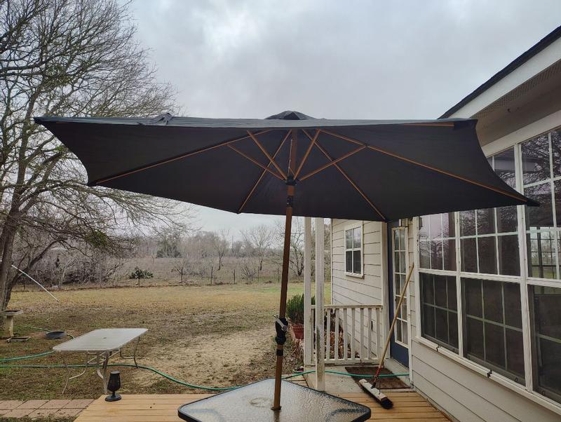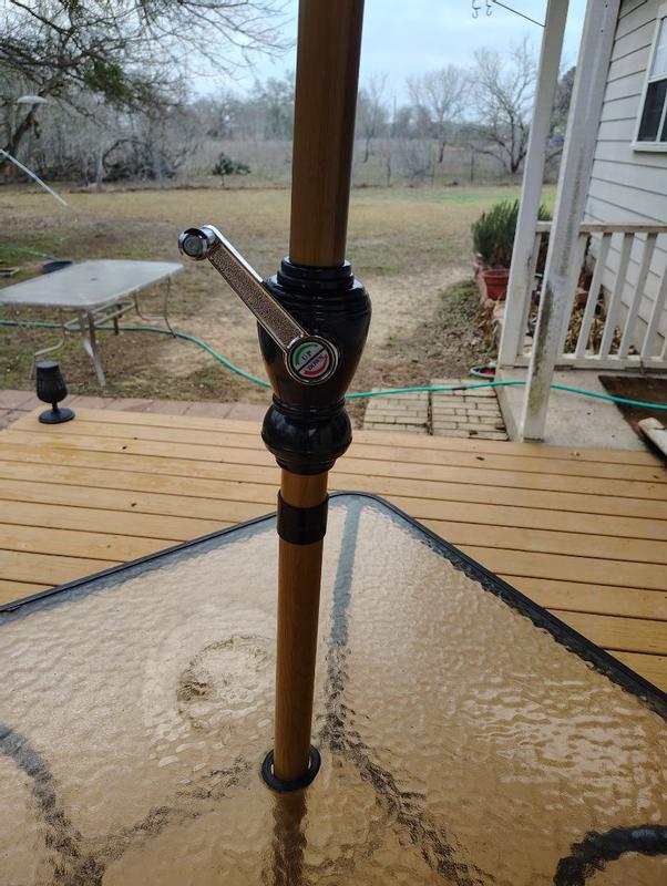 This umbrella is awesome. It is easy to open with the hand crank. It is huge and gives a lot of shade. It fits with all of our outdoor tables. It looks and feels like it will last a while, which is great here in Texas.