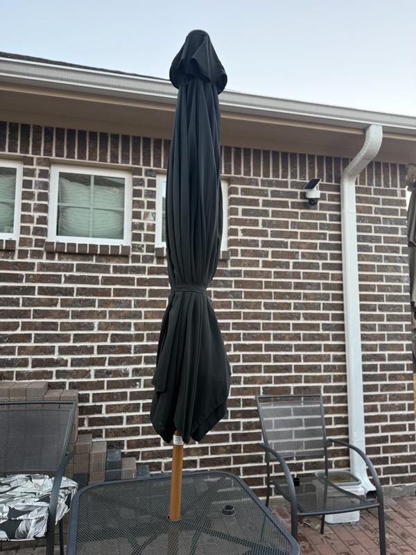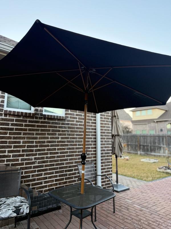 This umbrella looks really nice and adds a warm touch to the backyard. The wood grand design gets it a natural look, but it still feels study and well made. It definitely makes the patio area feel more finished. The crack system works smoothly and makes opening and closing it easy. The tilt feature is also very helpful when the sun shifts during the day. One thing to keep in mind is that it does not come with a base so you will need to purchase one separately. Its also a bit bigger than expected but that actually turned out to be a good thing because it provides a lot of shade.
