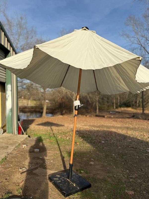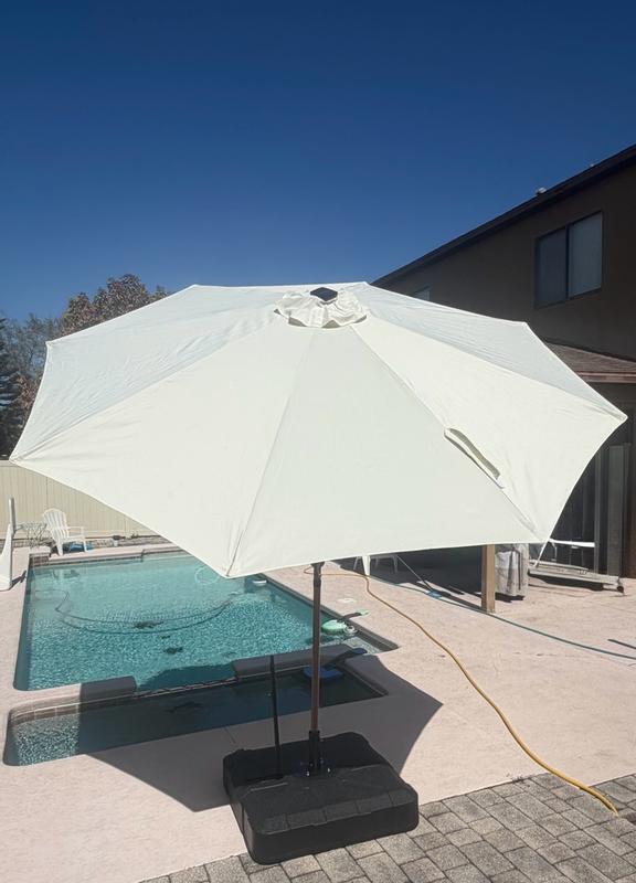 I am so excited to have received this solar LED lighted patio umbrella. It is easy to install as it comes in 2 pieces. The base was not included. The umbrella offers 10 foot of shade under its canopy. No need to worry as the sun moves, this umbrella tilts to keep the sunrays at bay. The material is durable and easy to crank open. The LED lights are nicely hidden and turn in with the switch of a button. This umbrella ties in perfectly with any decor style.