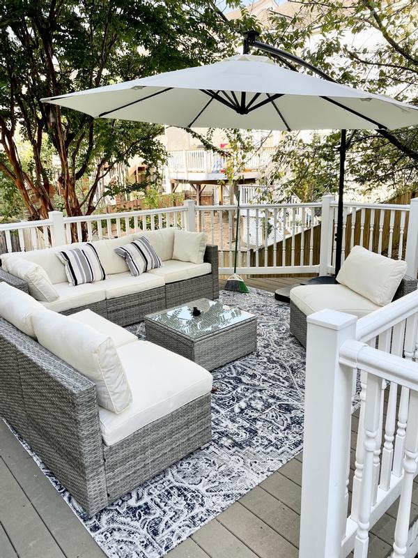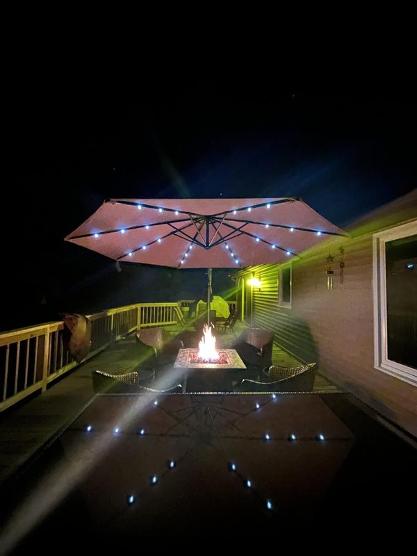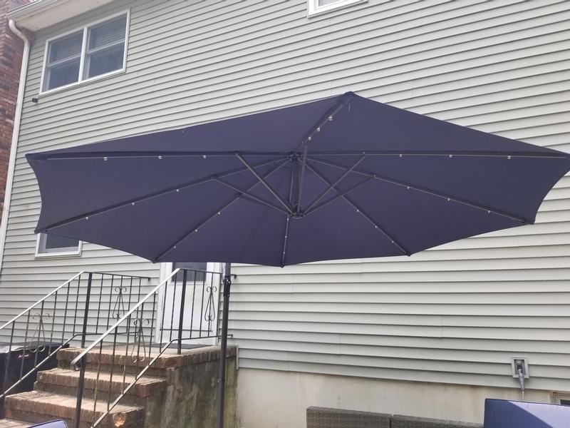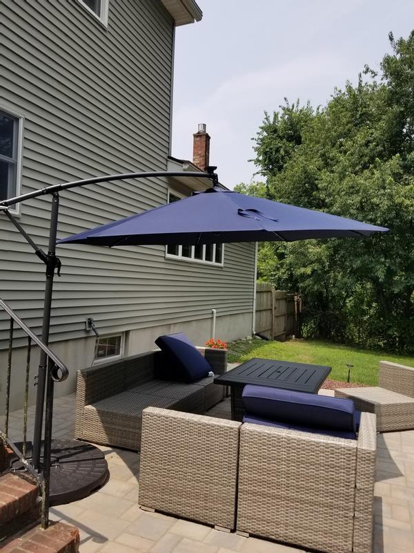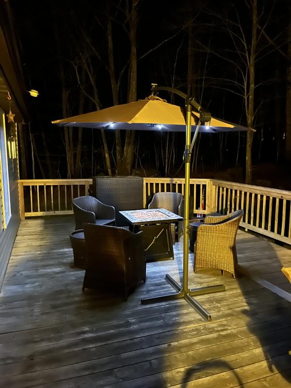 Enjoy 79 sq ft, of shade which means more room between you, your guests, and more BCP sets! Use it in the day and turn your outdoor dining area into a shaded lounge for family and friends. Solar powered LED lights also allow for night use reignite your passion for outdoor dining and brighten your summer nights. Find the perfect angle, as the handle on the pole moves up and down to adjust your umbrella's angle. Securing your umbrella is easy with weighted base sets that keep your umbrella upright. The included cross base is compatible with 4-piece weighted umbrella stands and will keep it weighted. The heavy-duty frame includes a durable steel pole to withstand many seasons! An offset design includes a 39.5-inch base that allows for sturdy, convenient placement. Plus, you can easily walk underneath the opened umbrella, as its lowest point rests 79 inches from the ground. The durable fabric 210g polyester canopy is dyed to be UV- and weather-resistant to prevent fading and last longer.