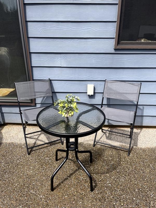 3-Piece Patio Bistro Dining Furniture Set w/ Round Textured Glass Tabletop, Folding Chairs
