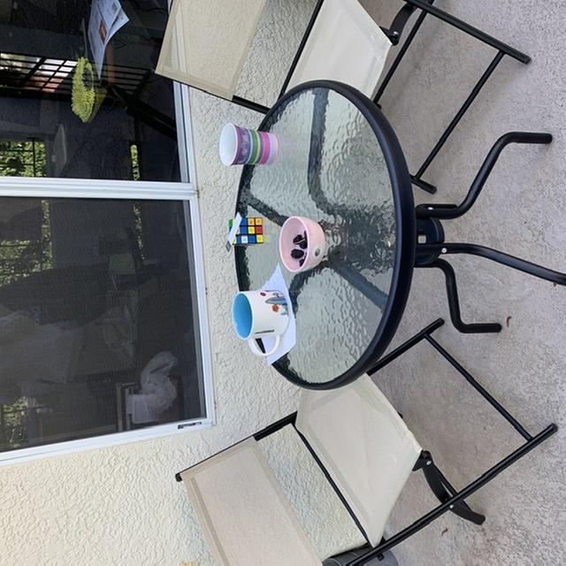 I love this adorable bistro set!! I didn’t have room on my deck for anything large, so this was perfect. Easy to assemble and the chairs are comfy!!