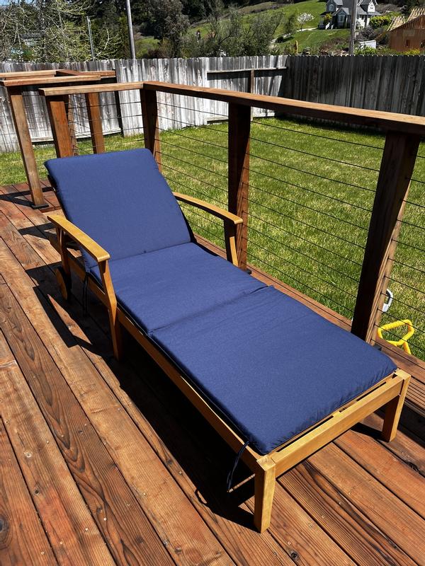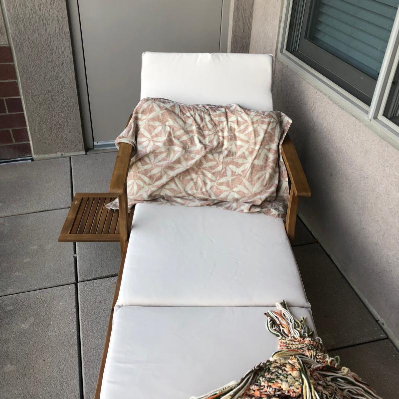 Fabulous lounge chair. The cushion is water resistant, and the fabric feels durable. Simple to put together and wheel to where you want it to go. Love the side table, it just makes sense!