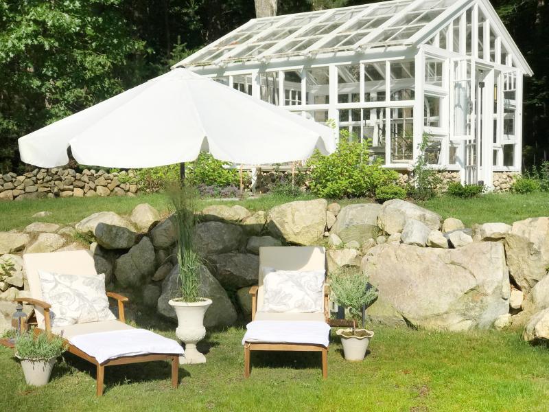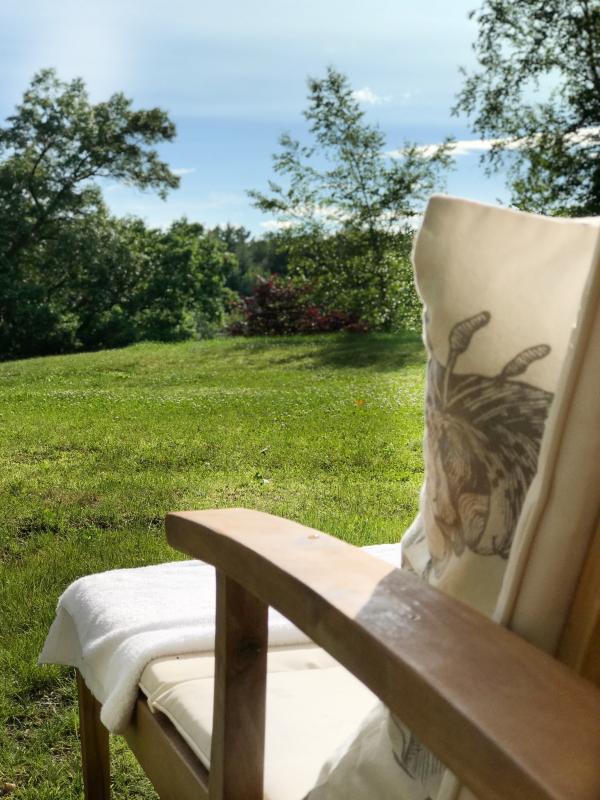 Perfect for knitting and reading on the deck with my dogs. I got it because it's strong enough to have both dogs on it with me. The arms are a perfect height for reading or knitting. Easy to put together (took two of us less than an hour.) Sturdy construction and high quality wood. The cushion is very nice as well, water resistant but comfortable. I'm so happy I purchased this.