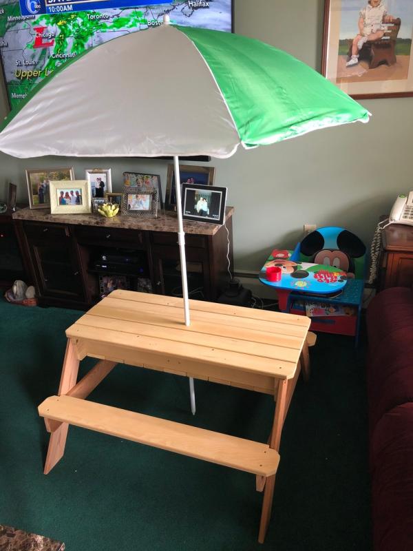 Bought this for a friend’s son’s first birthday and she told me how much they are enjoying it at their home. Nice and portable, providing some much needed shade. Perfect size for the little ones and could fit probably four little kids at a time! Delivered quickly and in one box for assembly. Really reasonable price on the website as you can see how sturdy and good quality it appears in the photo as well. No known splinters as of yet which is important for little ones using wooden furniture so I would run fingers across it to make sure there are no sharp areas prior to kids using as a precaution just in case.