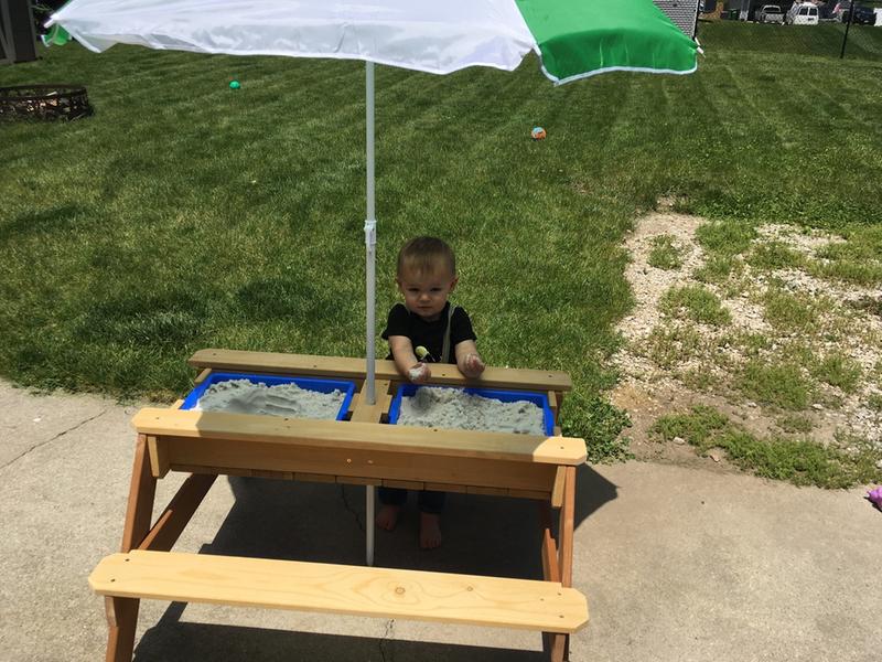 Took me awhile to find one of these of decent quality at a decent price. Was relatively easy to put together. The umbrella is well made. Good sturdy wood, definitely wouldn't support an adult's weight, so just a little part of me wishes it was even sturdier so I could squeeze next to my kiddos sometimes to help them out, but I guess I just don't belong there ;p It could also use a finish, but that can be done yourself at home. Kids LOVE to dig in the sand and water and make messes, I set this up above the sandbox so the sand falling off goes right back into the sandbox. Kids love it, hours of entertainment.