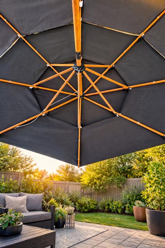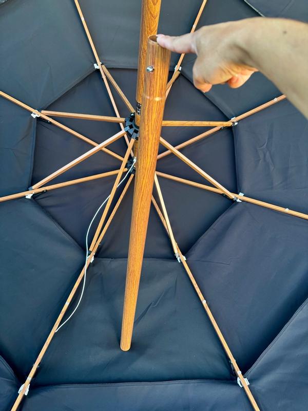 The best choice products patio umbrella is stylish with a woodgrain finish and good quality. The fabric is sun resistant,the tilt adjustment is easy to use , and the solar LED lights work well at night. Perfect for any patio or garden just close it during strong winds.