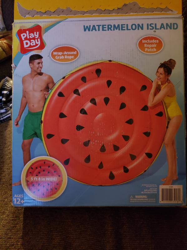Play Day Watermelon Island is HUGE!! It can fit 2 adults easily, maybe 3. It has a rope around it to make it easier to pick it up or move it. This thing is awesome. If you're planning on bringing it somewhere to use it, you will have to inflate when you get there, top big to fit in my SUV. That's ok, I have a portable pump.