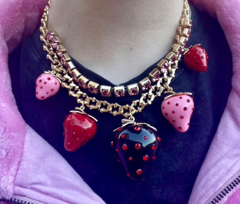 Striking curb chain necklace featuring glistening pink tennis strand detail and vibrant strawberry motif charms at front adorned with subtle stone accents.
