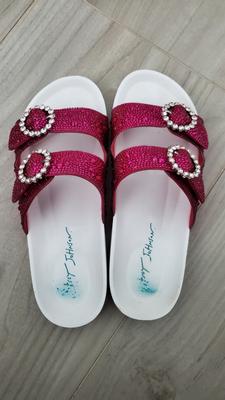 slides are adorable, beautiful deep magenta, size is true, I bought an 8, the fits is very good on the right foot, but the left sandal is very wide across the foot. there is no way to adjust the left sandal. I would have kept them except the left sandal was too loose.
