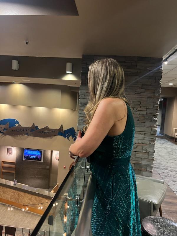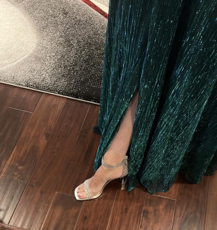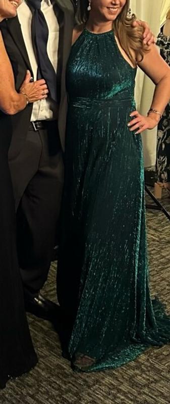 This is such a beautiful and classy dress. In the light it shimmers beautifully and is more of a green color. Love the high neck. I dressed it up with pearls. Just perfect.