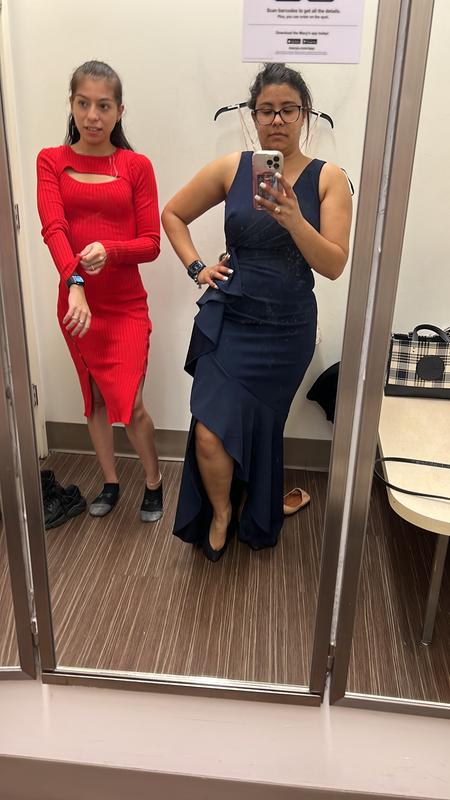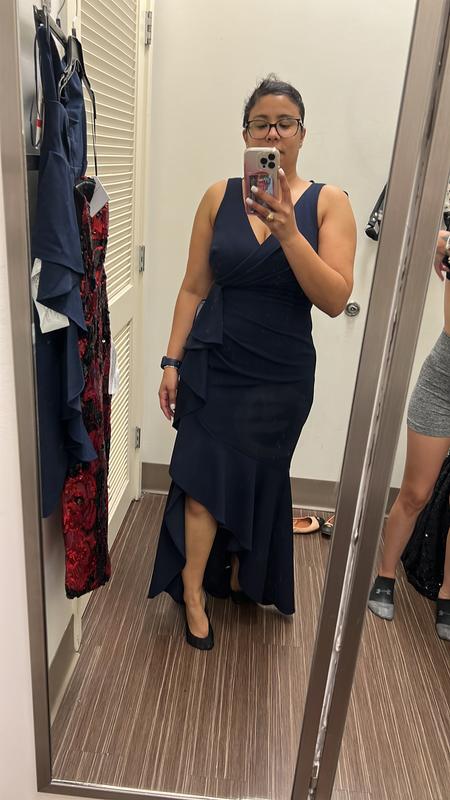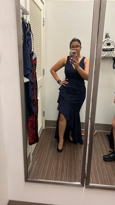 This dress is very flattering and forgiving, especially in the tummy area. It hugs you in all the right places and showcases your curves. It makes me feel so beautiful. The only thing that bothers me is that the part under the arms is a little tight on me. My upper body is a little bigger than normal due to weightlifting, so that part hugs my under-arms too close. The zipper in the back bunches up a little, probably because I’m so short. I will , however, keep it and use it as a guest dress to a wedding. I love that the dress is stretchy, so I’ll be able to move around and dance and sit with ease. It passed a squat test. Without wearing shoes, the back of the dress goes all the way down to the floor. If I wear at least 3 inch heels, it will be the perfect length. I ordered a petite. I am 5’2”, 144 lbs, and usually a size medium.
