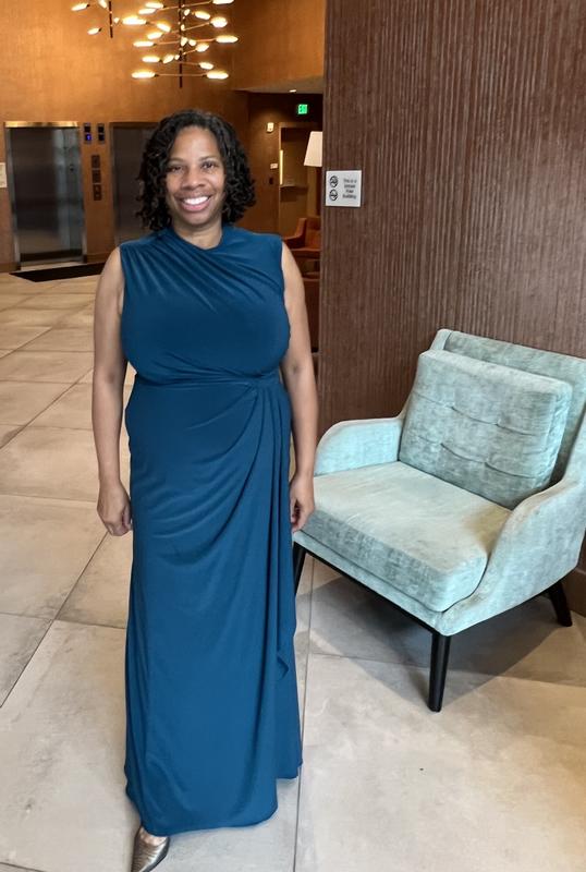 The dress is beautiful. Very flattering. The color is deep and riich. The bling at the neck sets everything off perfectly.
