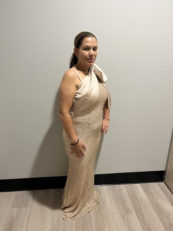 Web ID: 23350887A true visual delight, this Betsy & Adam gown showcases a sophisticated one-shoulder neckline with a side zipper closure for a seamless fit. Crafted from stretchy fabric, it's beautifully accented with a contrasting bow detail that adds a touch of charm.