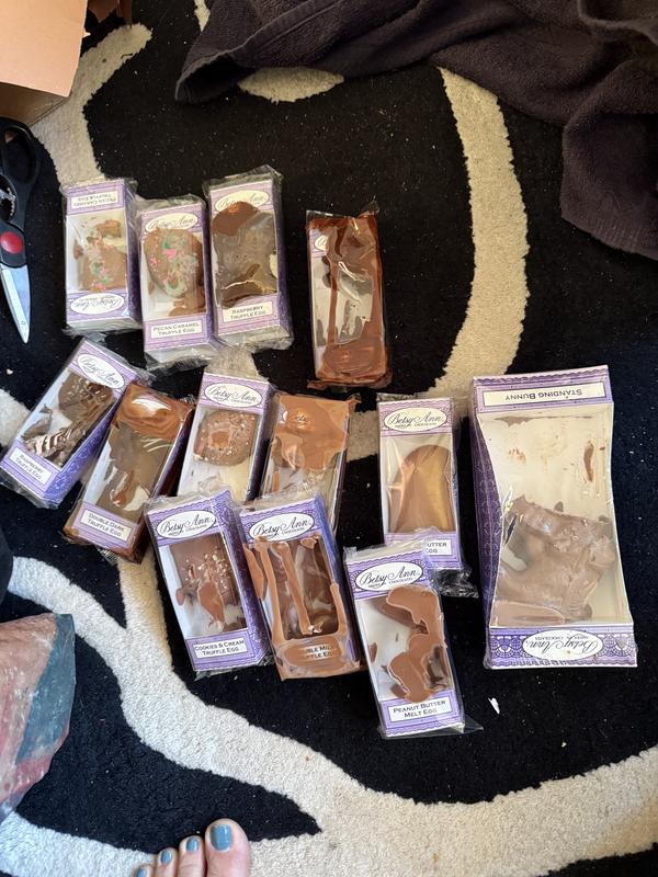 Includes: 8oz mini Easter eggs wrapped in festive Easter colors and a 6oz standing bunny, both made from the same solid, pure milk chocolate
