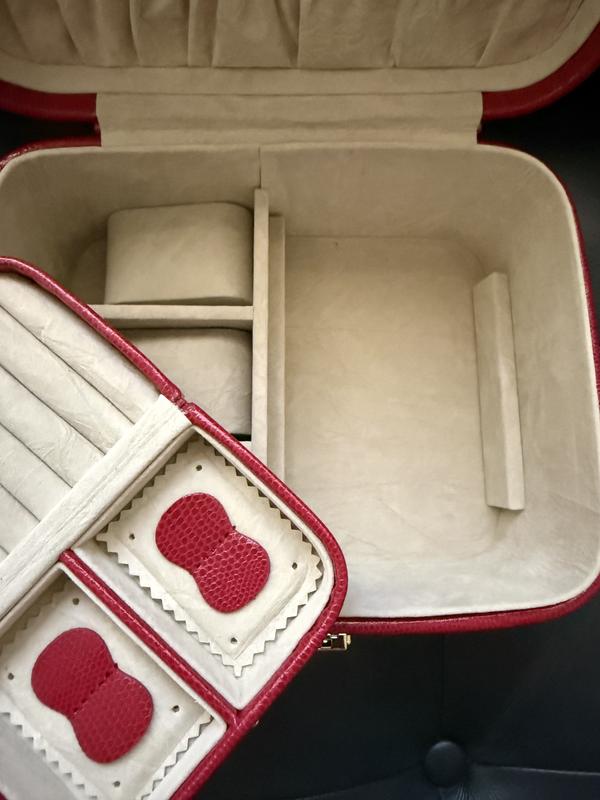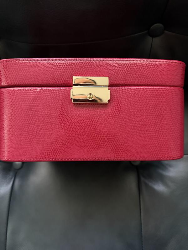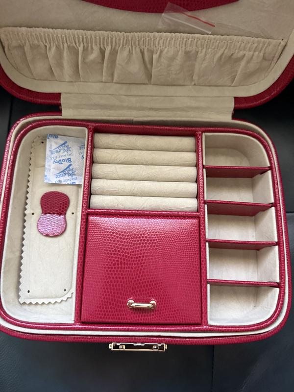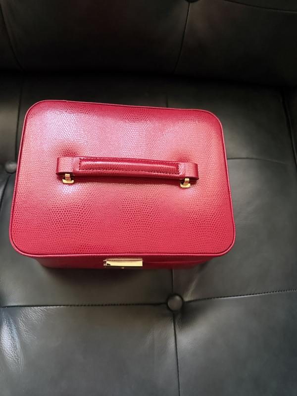 When I was searching for a jewelry box, was not locating any with the features I needed it on the inside. Luckily I kept scrolling and saw this one. Really did not want red, but it was the only color selection. I ordered it anyway and figured I could return it if I didn’t like it. It arrived and I was pleasantly surprised. It’s very pretty. I love everything on the inside in the red isn’t bad at all. I’m very happy and I can’t wait to organize my jewelry in this box. It’s solid seems well made, and I anticipate this lasting for a very long time. I would recommend the purchase.