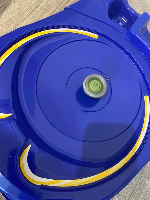 Nice bright blue base, no assembly required, easy to use and light weight, doesn't appear to be the most sturdy construction material. Quick wrist action required to spin and attack competition, needs practice to get used to directing "tokens",