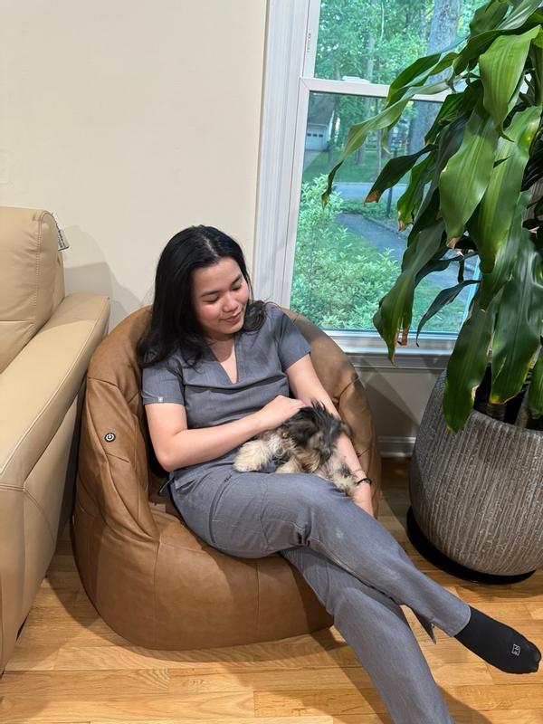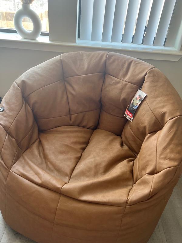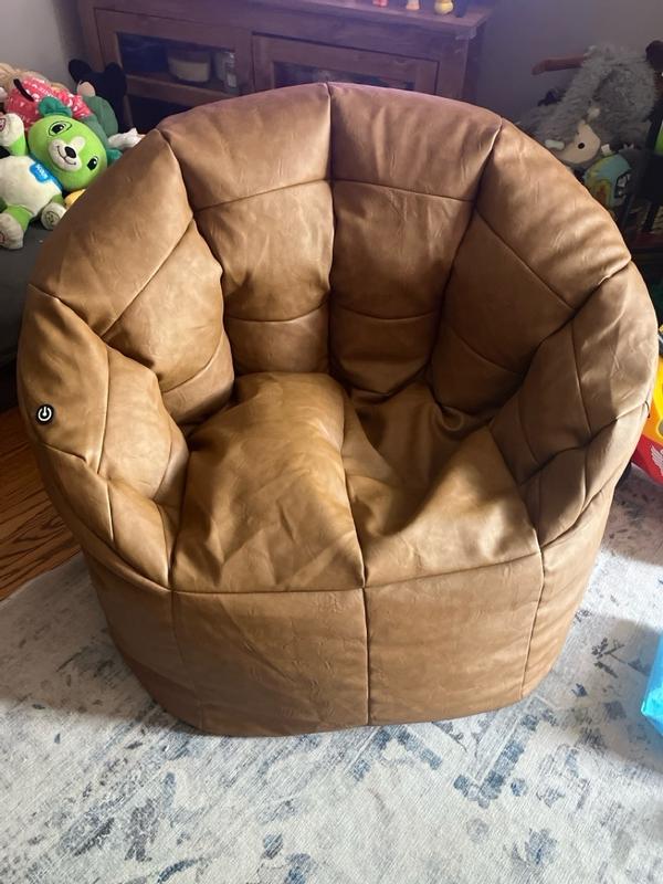 This comfy chair looks and feels like leather and is a neutral color that goes with any decor. As a beanbag chair it is inherently casual, yet the style is a bit elevated. It is easy to clean and features a high back and support for your arms. It has one side pocket for the USB charging cord. Very nice!