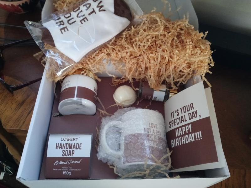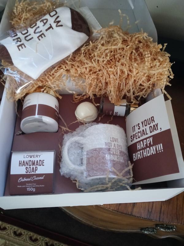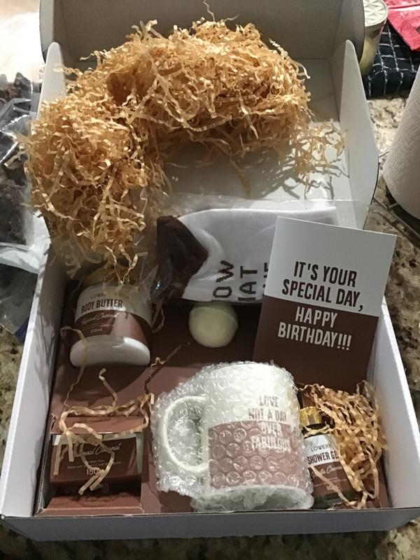 This is the perfect birthday present you could give someone, If you have no idea what to get this is it. The set includes (1) Vanilla Coconut Shower Gel, (1) Coconut Body Butter (1)Handmade Soap, (1) Coconut Bath Bomb ,(1)"Love, Not a Day Over Fabulous" Porcelain Mug , (1) pair of "If You Can Read This, Know That I Love You More" Fuzzy Socks and (1) Birthday Greeting Card . I Gave this to my sister and she mention it being one of the best gift she ever receive. The hand soup , shower gel and bath bomb all smell amazing and leaves your body feeling soft and moisturized. I recommend this gift to everyone.