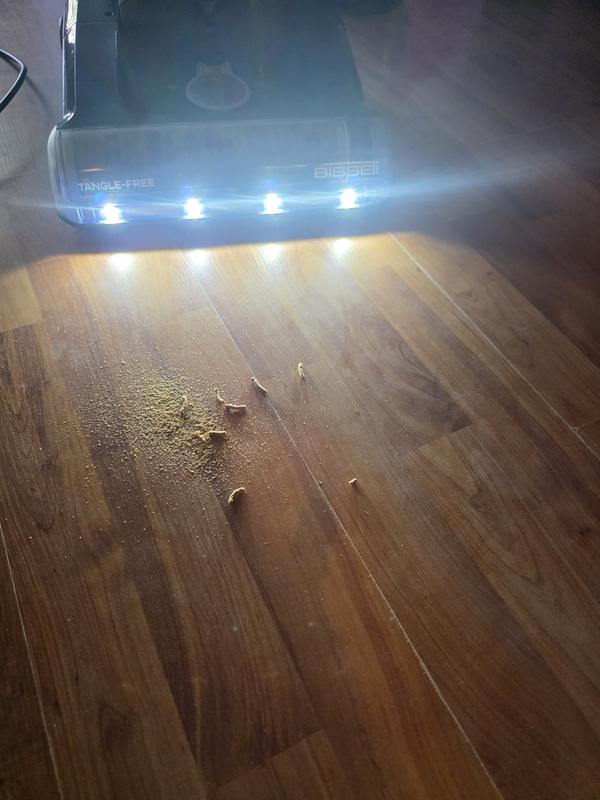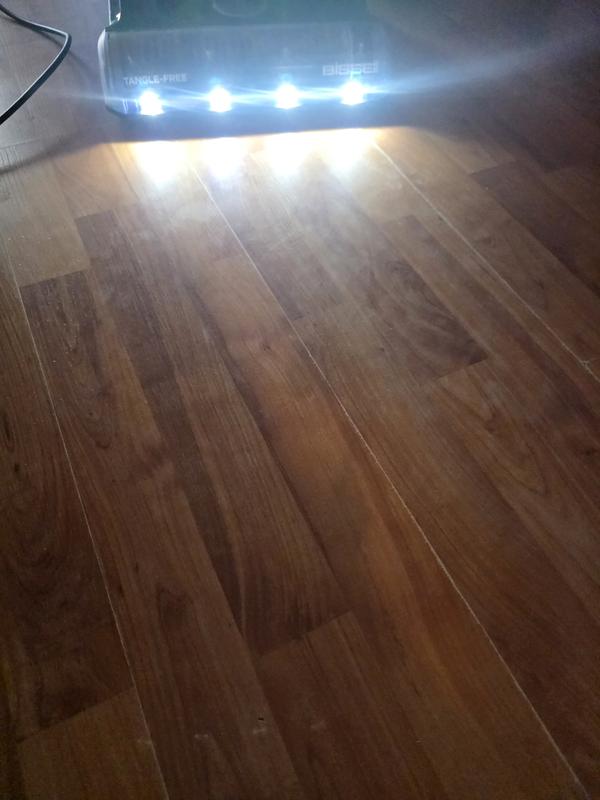 I have always been aggravated when hairs, not necessarily dog hairs per se, get all tangled up in the rollers of a vacuum. I have long hair and my dog has toys that she rips apart that leave long threads, both get tangled up in other vacuums. I did enjoy this vacuum for having a tangle free brush roll. I did notice when I put it together to use for the first time that it had somewhat of a "cheap" feeling to it like it may not last long, but of course it is too soon to tell. The swivel steering made it so easy to maneuver around furniture like tables and chairs, but I kept worrying I would swivel it "out of control" and break it at some point. All the debris my dog and our feet have brought in the house was easy to vacuum, especially on bare floors. It also did a good job on runners in hallways, but it was more difficult to use on shag carpet and did not clean that as well. There are also settings to choose higher pile or lower or no pile for bare floors. The knob is easy to turn. The lights are bright and a huge bonus for showing dirt, I did not even have to turn the lights on in the hallways when I was cleaning! It did a great job of picking up hairs, dirt, sand, and even cereal that had spilled, so that was a plus. I really love having a cord rewind feature because one thing I hate about vacuuming is having to wrap the cord when I am finished. With this Bissell, you just tap on the button and the cord winds up for you automatically, no need to bend over and drag the cord and wrap it! The extensions made it easy to reach some spider webs we have neglected around smoke detectors and in corners, even for me at 5'4". The extension wand was also easy to release and use. I will definitely use it daily for quick cleanups, especially when I need some lighting or the wand. The suction is powerful enough even when using the extension wand and it sits on board the vacuum without falling off during use. I found the vacuum to overall have a good design and maybe not of superior quality, but not a bad vacuum for the price-point. It does get the job done and is easy to dump out and clean for the next mess. It is also not too heavy or back breaking to maneuver.