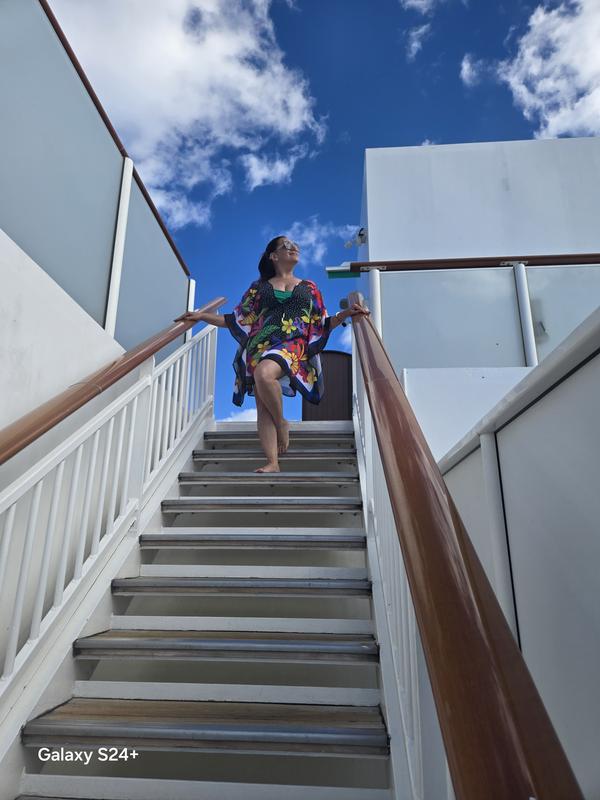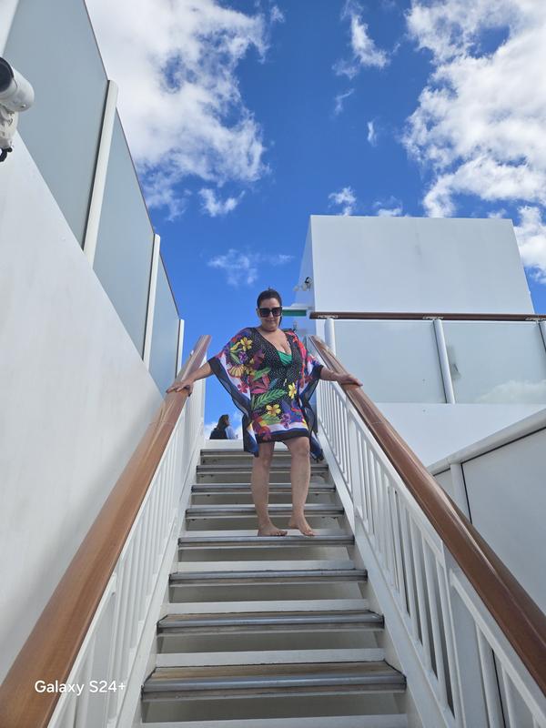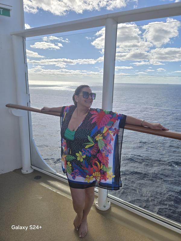 Stand out on the sand in this bold, printed sheer cover-up caftan from Bleu by Rod Beattie.